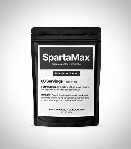 SpartaMax is a dual-action organic binder formulated with a balanced blend of zeolite and chlorella, two naturally occurring ingredients widely used in wellness and nutritional applications. This product contains 300 grams of finely milled powder, providing 60 servings, and is raw, organic, and unflavoured. It is produced using high-quality source materials and handled under strict quality standards to ensure consistency and purity. Each batch is carefully prepared to deliver a reliable, uniform product suitable for inclusion in a structured wellness routine.Price: $80
